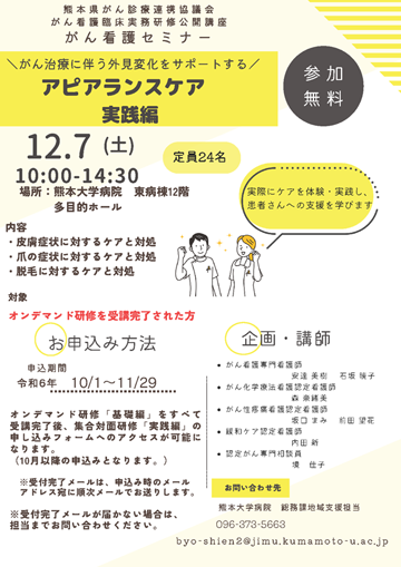 熊本県がん診療連携協議会がん看護臨床実務研修ワーキンググループでは、今年度は熊本がん看護セミナーをオンデマンド配信及び対面形式にて開催することになりました。