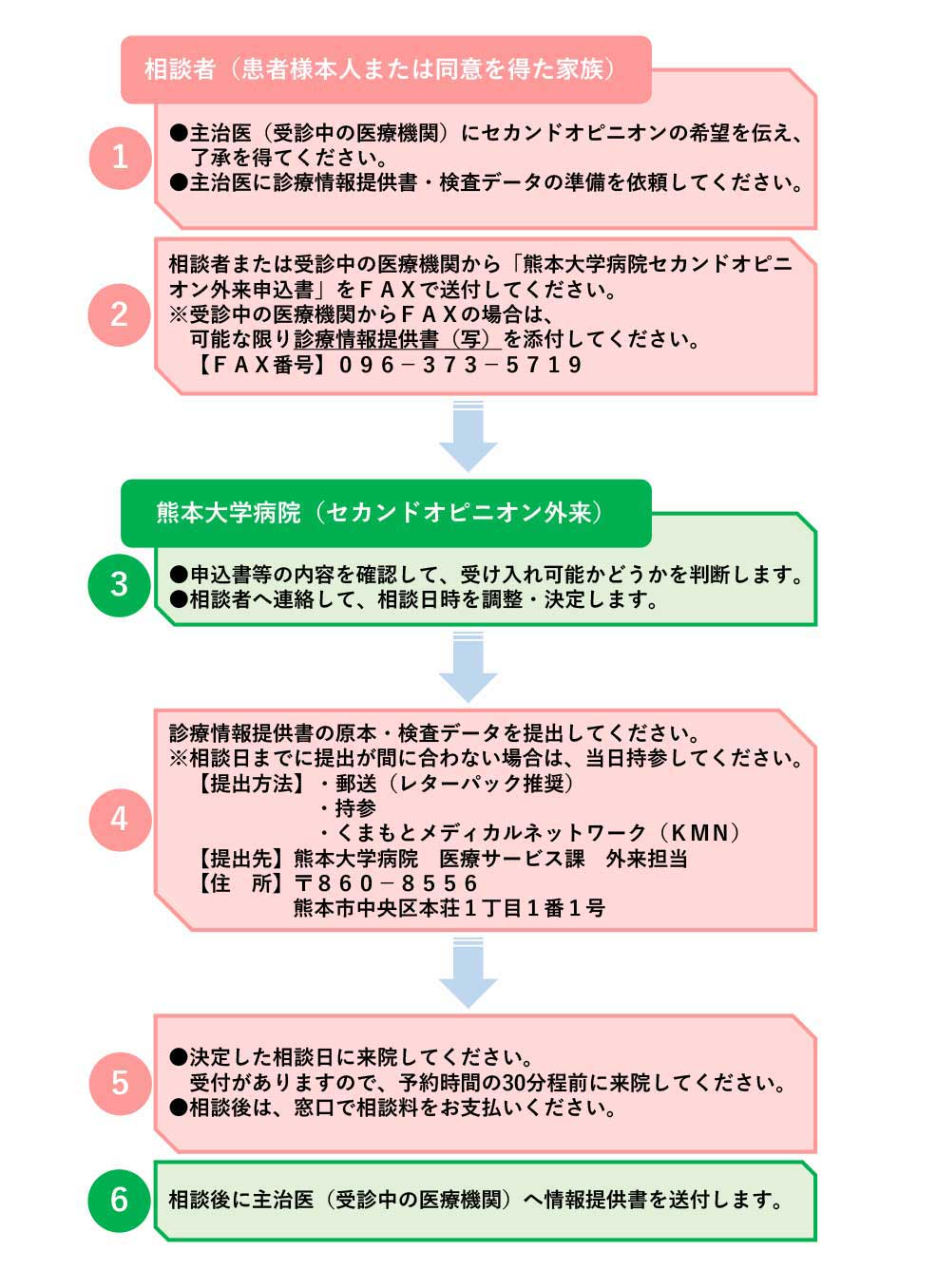 完全予約制になっています。本院のセカンドオピニオン外来担当受付へFAXでお申し込みください。 FAX送付状 熊本大学病院セカンドオピニオン外来申込書(PDF:41KB)